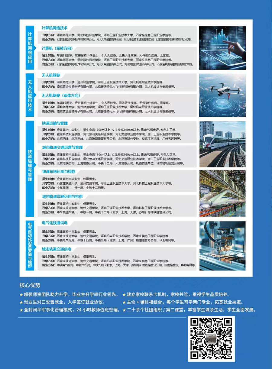 开设计算机、电子商务、消防工程、铁路、医学护理、无人机、汽修、幼师、会计等热门专业,数年来为社会各行各业输送了大量的人才获得了社会各界的一致好评。